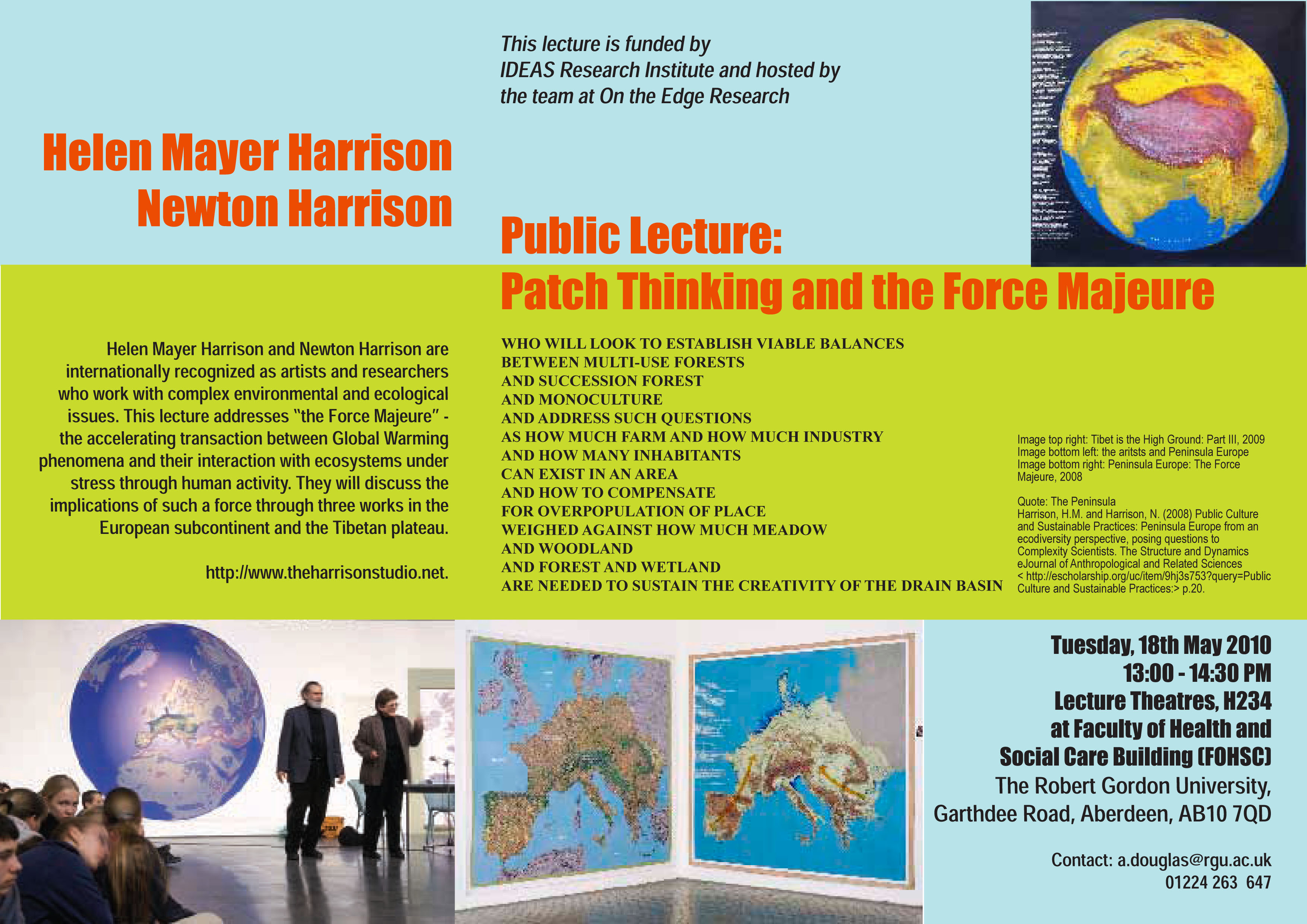 They will deliver a public lecture “Patch Thinking and the Force Majeure” on 18th May @1.00pm in the Faculty of Health and Social Care Building, Garthdee, Room H234.