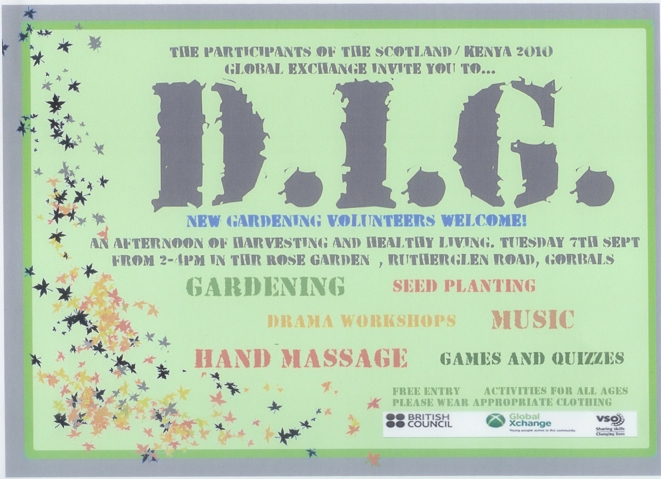 D.I.G. An afternoon of harvesting and healthy living, Tuesday 7th September, the Rose Garden, Rutherglen, the Gorbals. Share this: Click to email a link to a friend (Opens in new window) Email Click to share on Reddit (Opens in new window) Reddit Click to share on Tumblr (Opens in new window) Tumblr Click to share on Pinterest (Opens in new window) Pinterest Click to print (Opens in new window) Print Click to share on X (Opens in new window) X Click to share on LinkedIn (Opens in new window) LinkedIn More Click to share on Facebook (Opens in new window) Facebook Like Loading... Related Leave a comment Cancel reply This site uses Akismet to reduce spam. Learn how your comment data is processed.