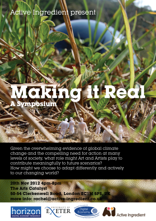 This symposium (open to fifty attendees) will present work resulting from an innovative collaboration between artists in UK and Brazil and technologists working in the Digital Economy funded Horizon Hub at University of Nottingham, in collaboration with scientists at the UK Met Office and biologists at the Rio de Janeiro Jardin Botanico and schools and local communities in both UK and Brazil.It will showcase the work of Active Ingredient an award-winning arts organisation which has been working closely with computer scientists in the Mixed Reality Lab at University of Nottingham as well as with Silvia Leal, an artist living in Rio de Janeiro.