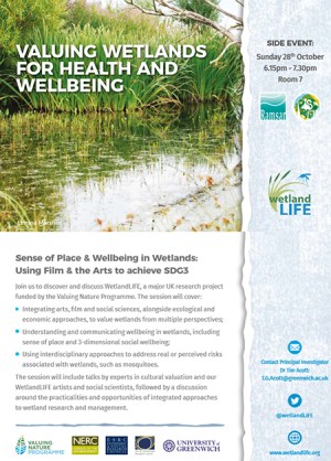 It’s the first time I’ve been to a COP, but for a long while I’ve been curious about how they work and what’s involved. What I did know was that the Ramsar COP13 offered a unique and significant opportunity for WetlandLIFE to internationalise our impact and to make important new connections. WetlandLIFE is a three year multi-institutional research project funded by the Valuing Nature Programme, exploring narratives and values around wetlands, particularly from a health and wellbeing perspective, and also the role of mosquitoes within this. Our research is focused in England, but our interdisciplinary approaches and findings have far broader applicability. So, I applied for a competitive place to host a “side event” at the conference. Held at lunchtimes and in the evenings of the COP, in between the plenary discussions, these side events provide an opportunity for organisations to present and discuss ideas and projects to the most relevant and global audience of wetland practitioners and experts that you could ask for.