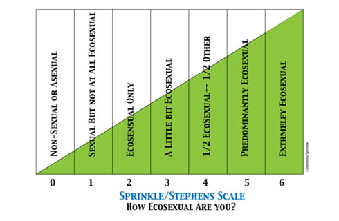 Throughout the book, the project-related texts give great insights into the blossoming of the Ecosexual Position. These texts could stand alone for use in classroom or group discussions, they include: artist statements, manifestos, wedding vows, wedding homilies, how-to-guides, lyrics (by Peaches), protest chants and protest signs with slogans such as: “FUCK DON’T FRACK!”, “COMPOSTING IS SO HOT!”, DIRTY & PROUD”, “ECOSEXUALS UNITE!”. In another kind of protest, readers who are firmly against marriage will be pleased to see Barbara Carrellas’s Top Ten Reasons Why Marriage Should Be Abolished!!! included with the account of the Red Wedding. Furthermore, the selection of full-colour archive images, and the diagram of the “Sprinkle/Stephens Scale: How Ecosexual are you?” will also be revealing to the uninitiated.