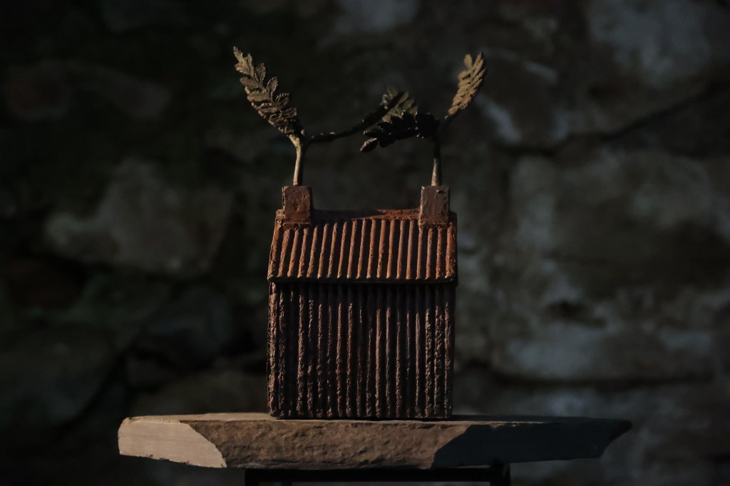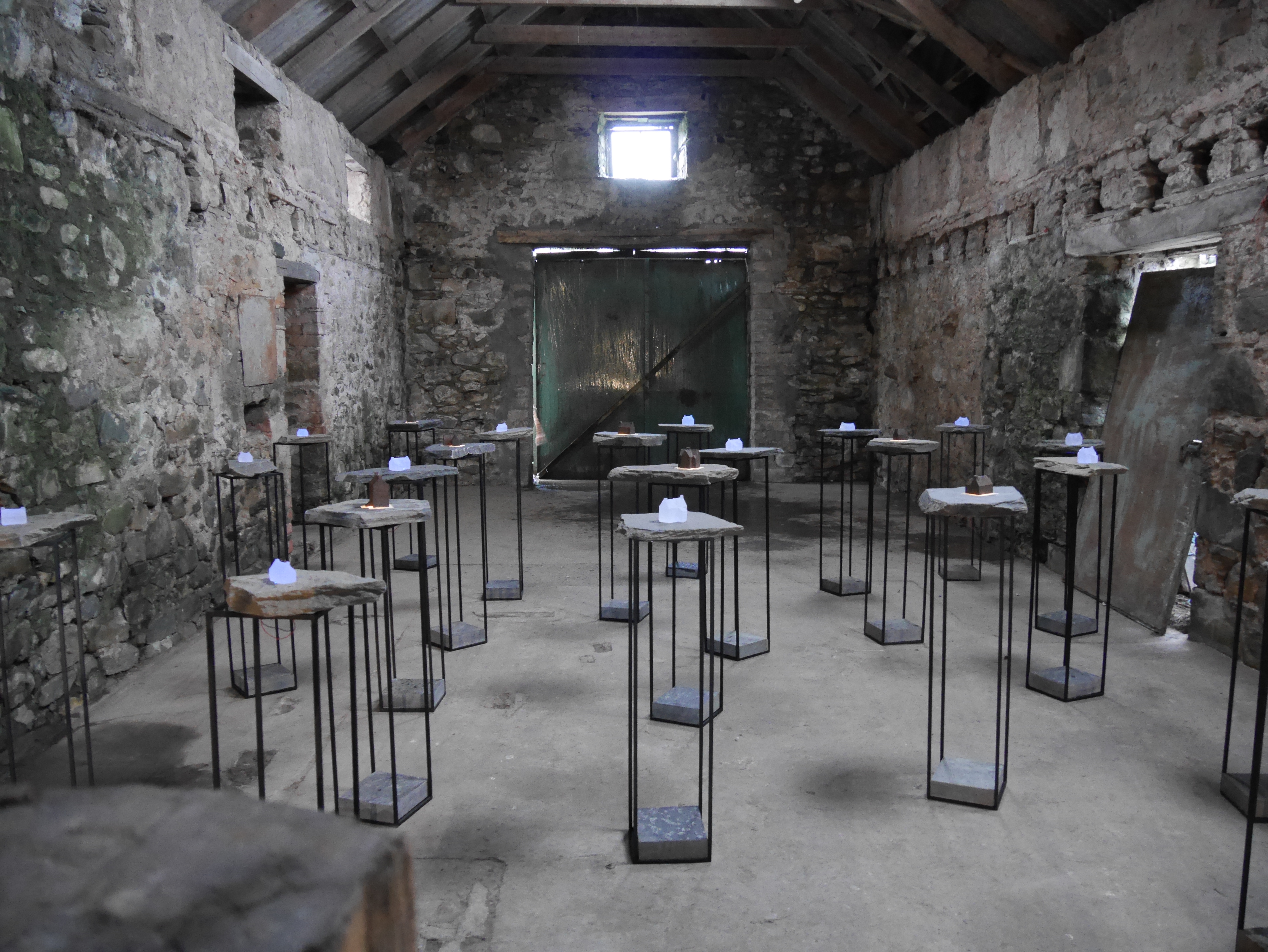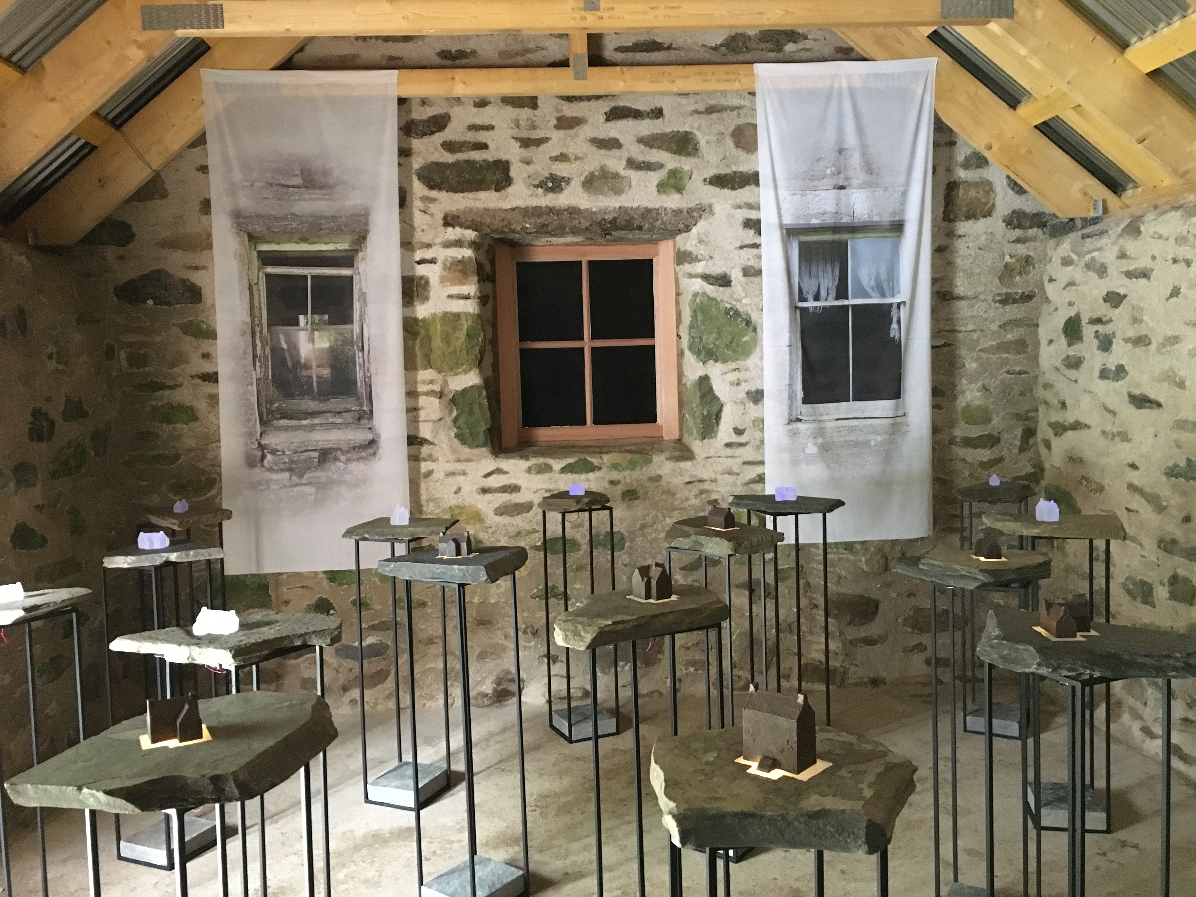 Upper Cabrach Houses – this piece, using glass and iron, materials we saw lying around the old houses, remembers the “ghost houses” which now lie dark.