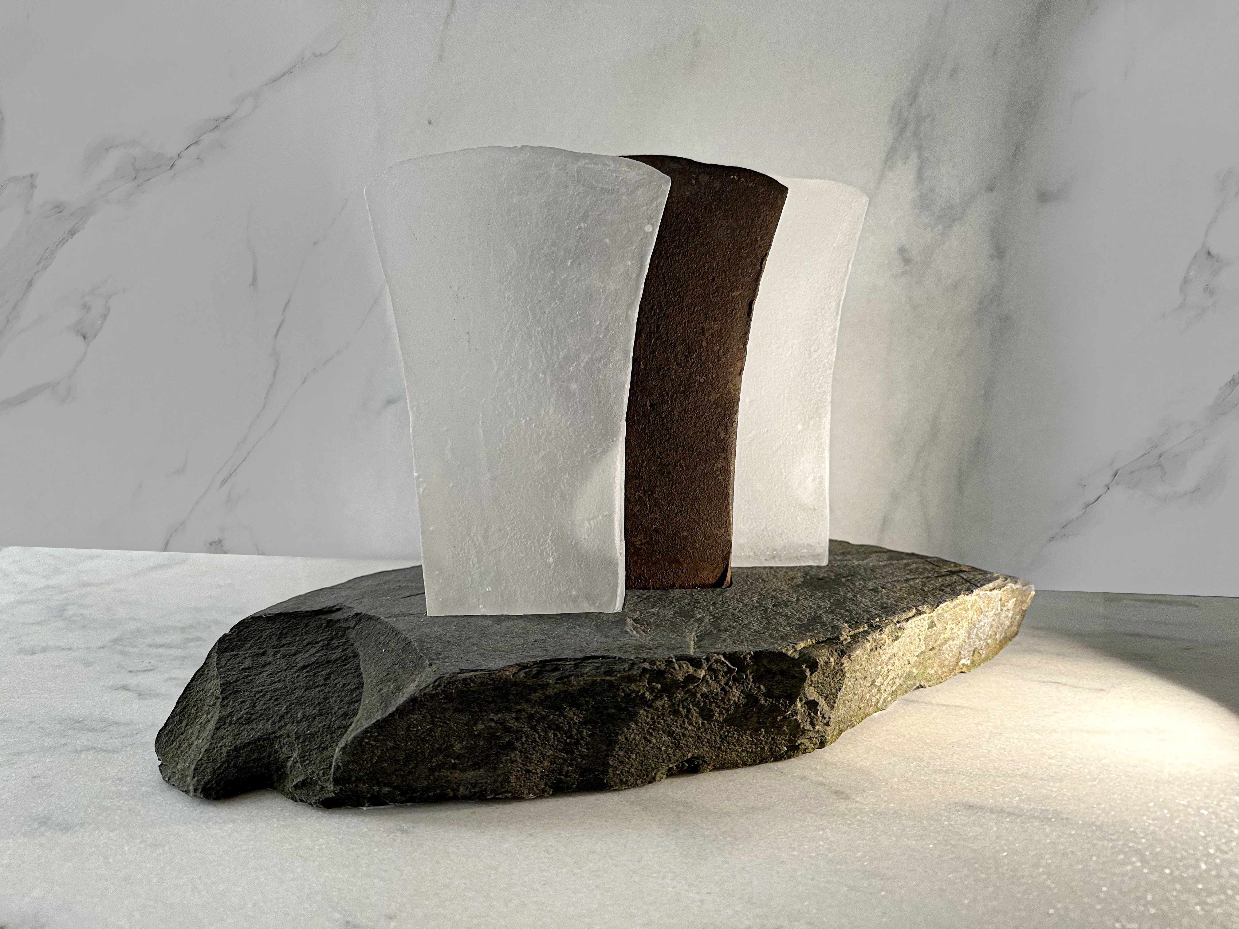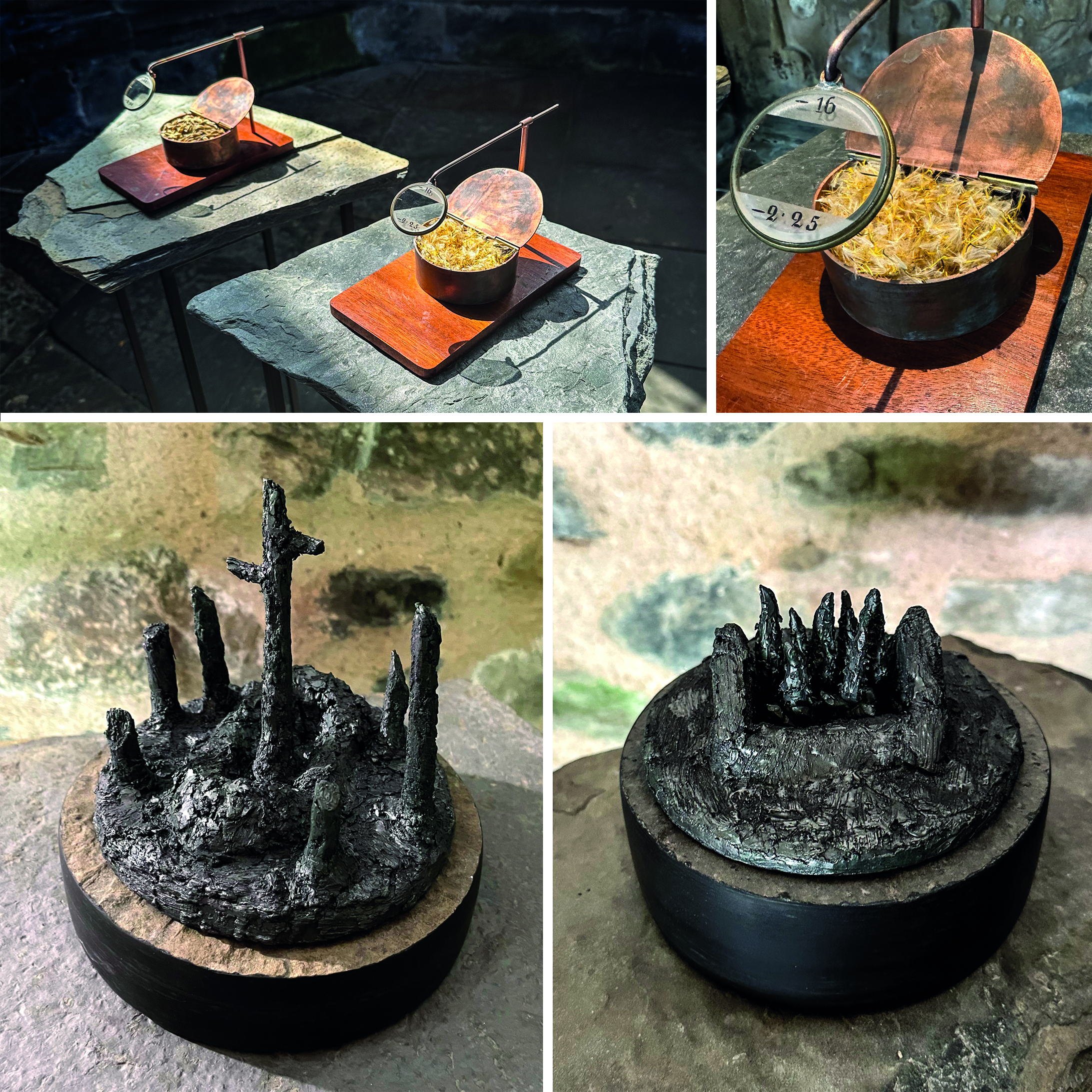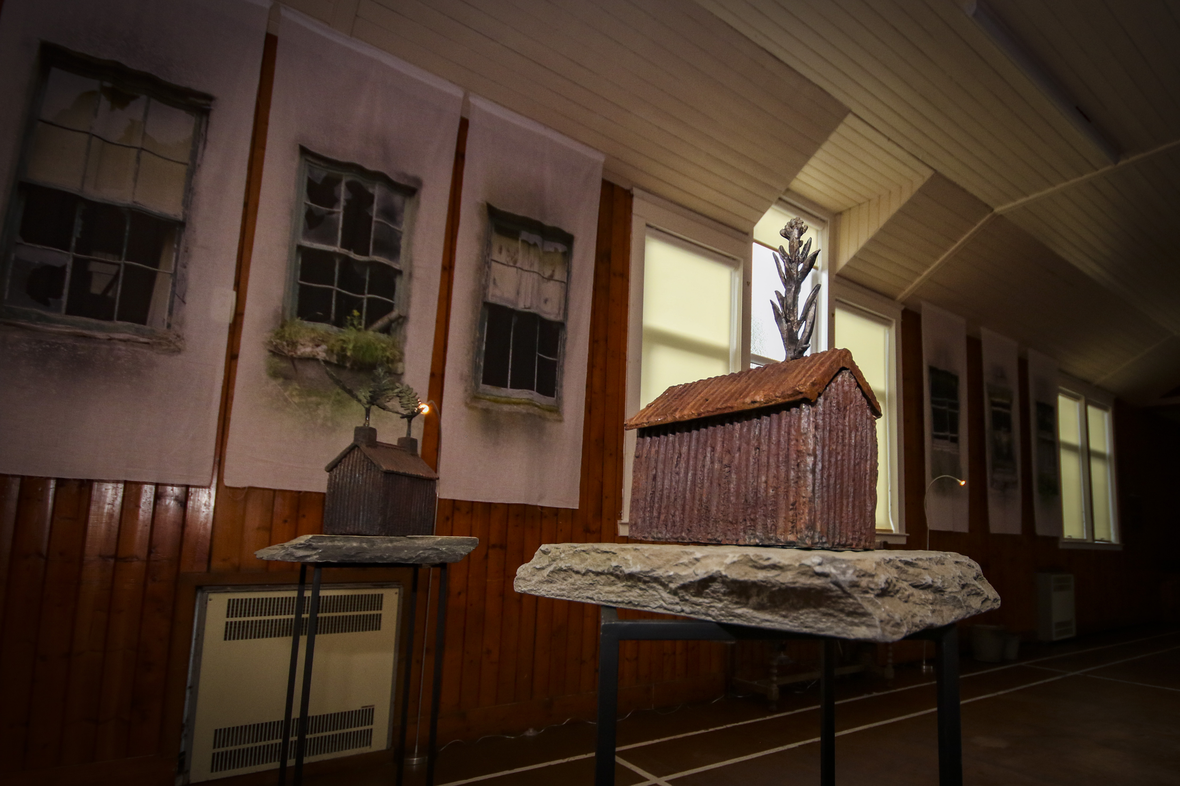 Upper Cabrach Houses – this piece, using glass and iron, materials we saw lying around the old houses, remembers the “ghost houses” which now lie dark.