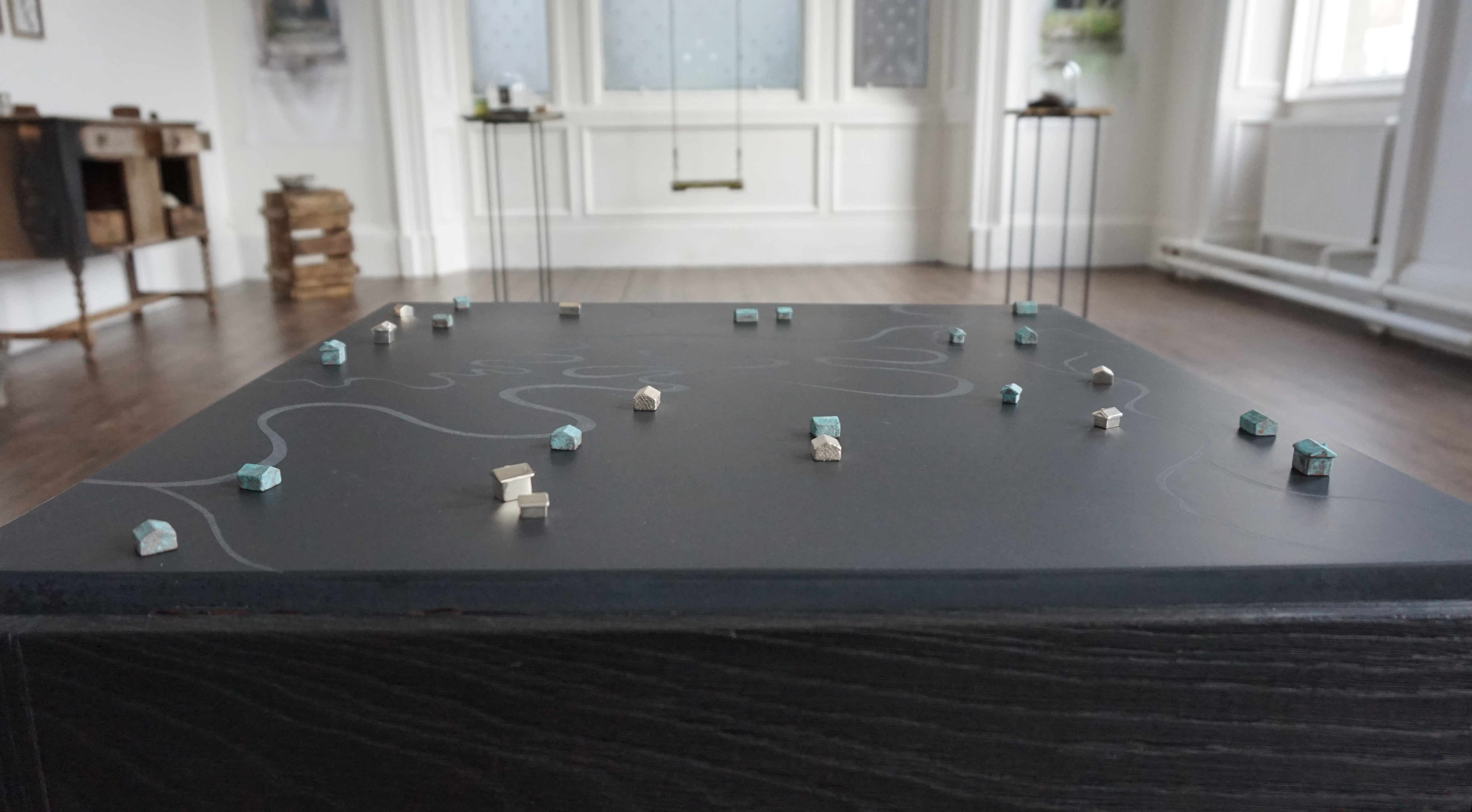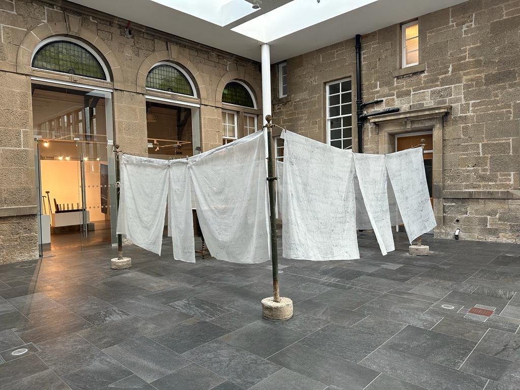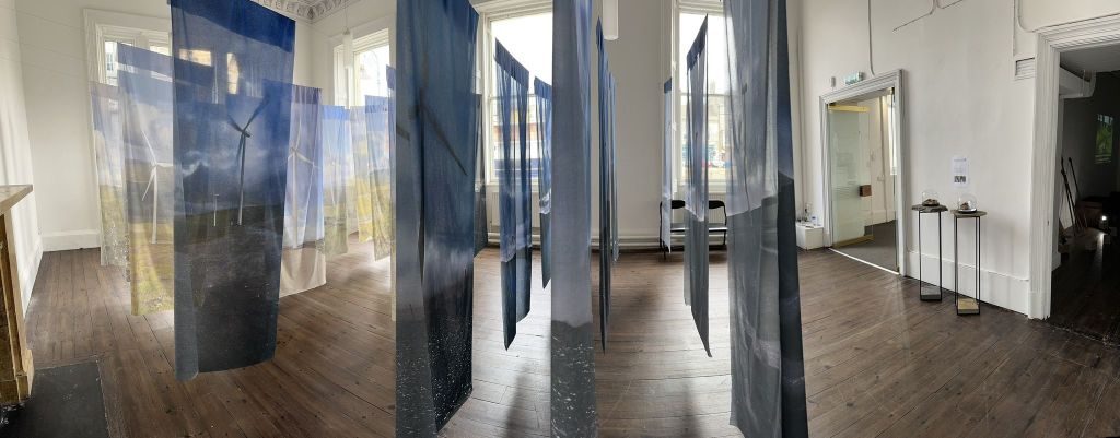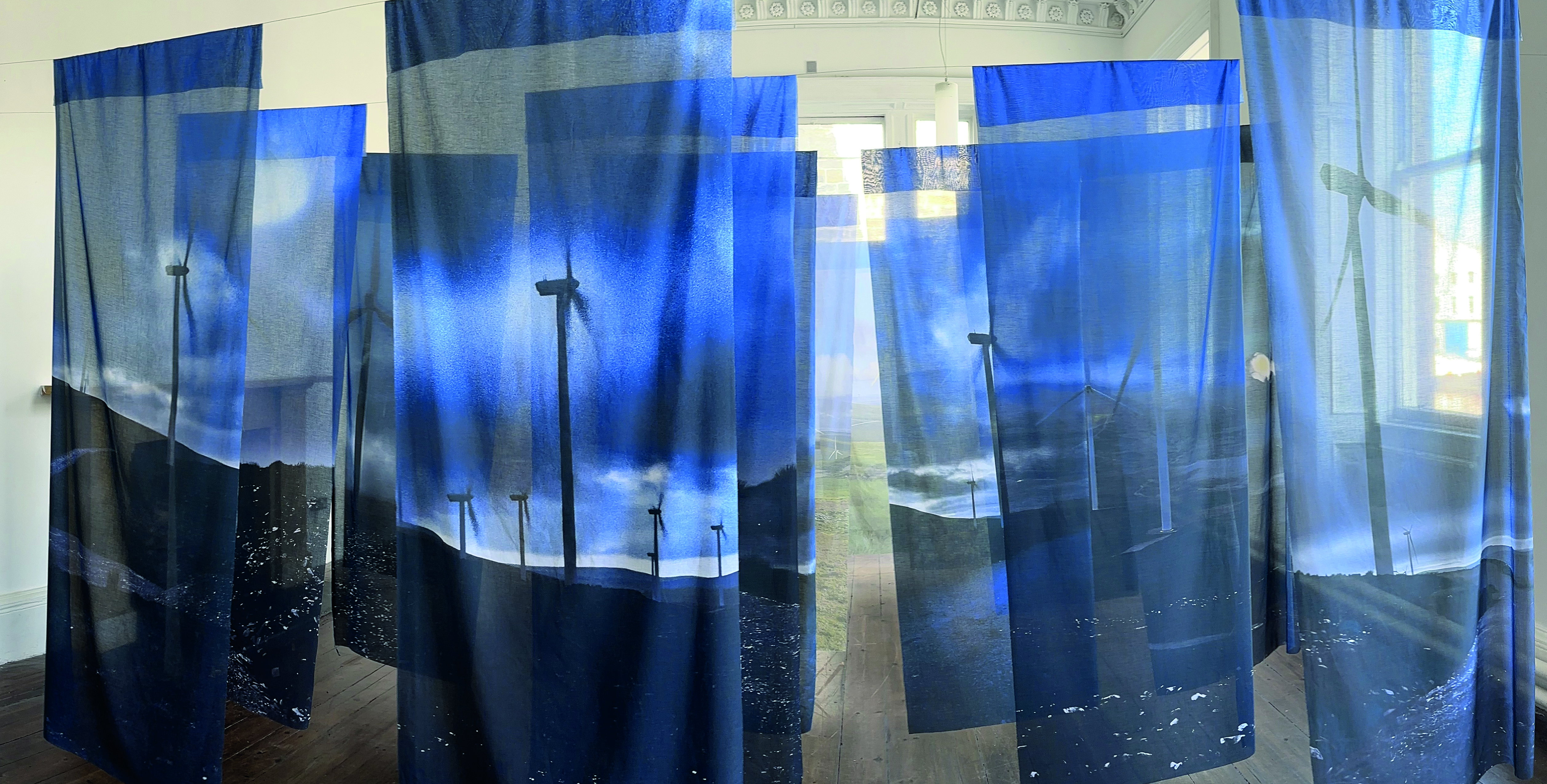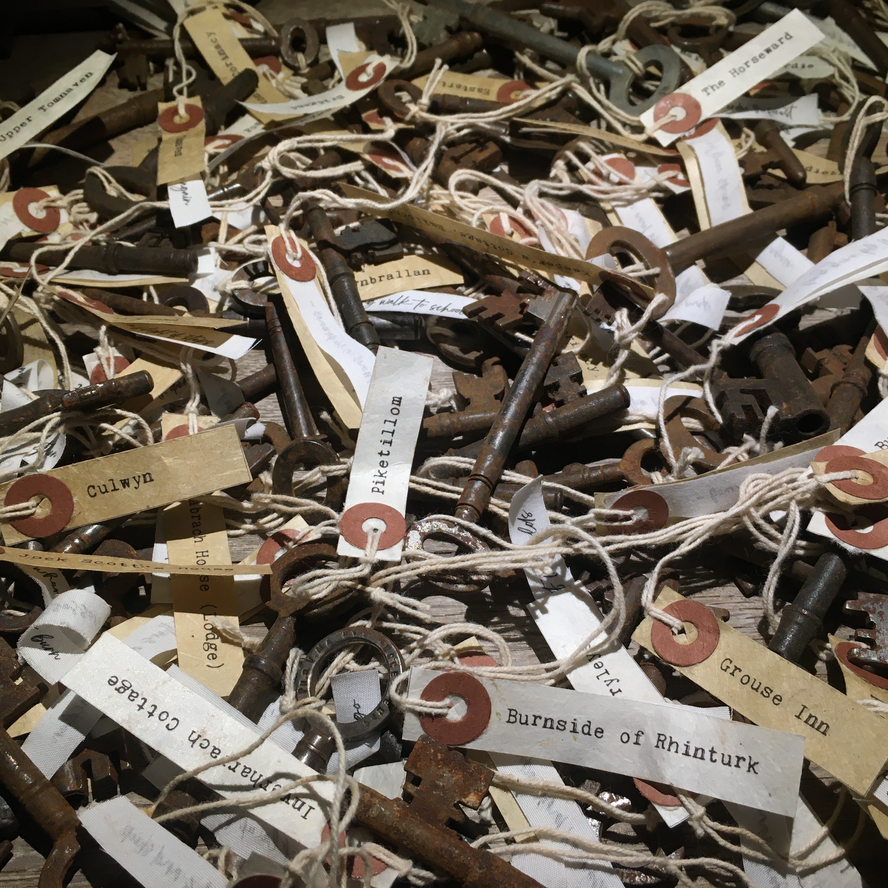 Cabrach Keys: a big pile of keys on an old dresser rescued from a shed in The Cabrach, surrounded by sheets printed with the names of Cabrach dwellings. We made two labels for every named dwelling we recorded – one with the name of the building, one with a snippet of information, or an experience we’d had there, and tied each pair onto a key. Exhibition visitors spent ages untangling them, reading the labels, and looking for their family homes. The blowing washing refers to the importance of wind in The Cabrach – in the past specific cloths hung on washing lines were used to warn illicit distillers of the approach of the gaugers, while now the coming of multiple wind farms is changing the character of the area.