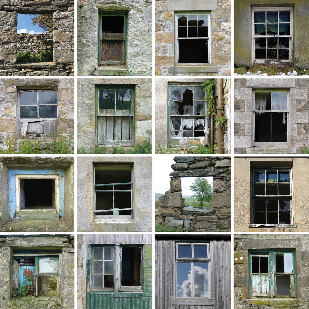 We took many photos of windows throughout the project. We realised that from the outside the reflection we could see of the landscape behind us was the view the long-gone inhabitants would have seen looking out through the window.