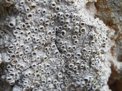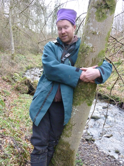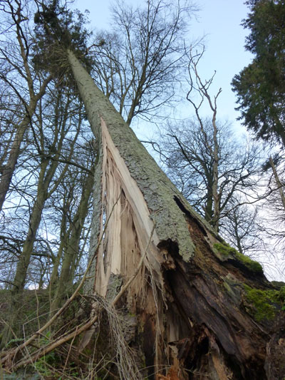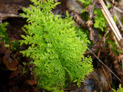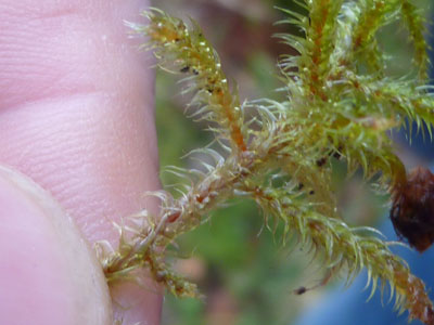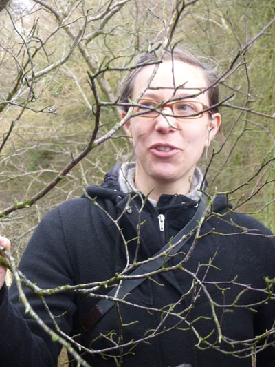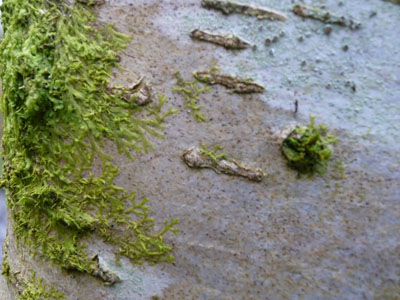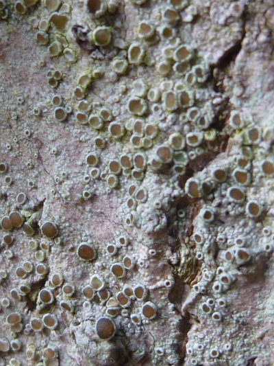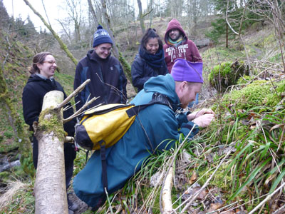Rosalie Monod de Froideville, our host. (Photo: Chris Fremantle)Joe Hope, our guide. (Photo: Chris Fremantle)Investigating the micro world. (Photo: Chris Fremantle)Thelotrema lepadinum sometimes called 'Barnacle Lichen', growing on an ash tree. This species is not common in eastern Scotland, and may be more-or-less restricted to ancient woodlands in this region. (Photo: Chris Fremantle)The 'jam tart' fruiting bodies of Lecanora chlarotera, growing the same ash tree as the above. This species is very common and widespread, quickly colonising young bark on a wide variety of tree species. (Photo: Chris Fremantle)The Common Tamarisk Moss, Thuidium tamariscinum, is a typical component of mossy woodland floors. It has a fractal structure similar to many ferns, where each branch is like a miniature version of the whole plant, and bears branchlets that are like miniature versions of the branch! (Photo: Chris Fremantle)The Forked Veilwort, Metzgeria furcata, advances across the bark of a Rowan tree, perhaps to eventually engulf the Lecanora chlarotera in the top right? Metzgeria is an example of a liverwort: primitive plants which are perhaps the closest living relatives to the first ever land plants which evolved some 400 to 500 million years ago. Metzgeria has no stem or leaves, just a simple branching 'body' which is just 1 cell thick. (Photo: Chris Fremantle)A single shoot of the Little Shaggy-moss, Rhytidiadelphus loreus, which often forms great wefts and cushions on woodland floors where the soil is acidic. It can be be distinguished from other branchy mosses by the red stems and the distinctive way the leaves all curl over in one direction, towards the stem on one side, away on the other. (Photo: Chris Fremantle)Recent storm damage in Kitleyknowe Glen. (Photo: Chris Fremantle)